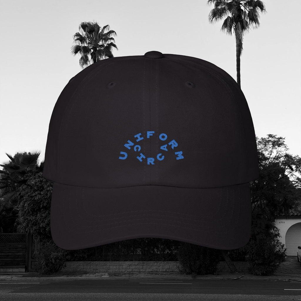 100% cotton Dad Cap. Self-fabric hideaway strap with antique brass buckle and grommet