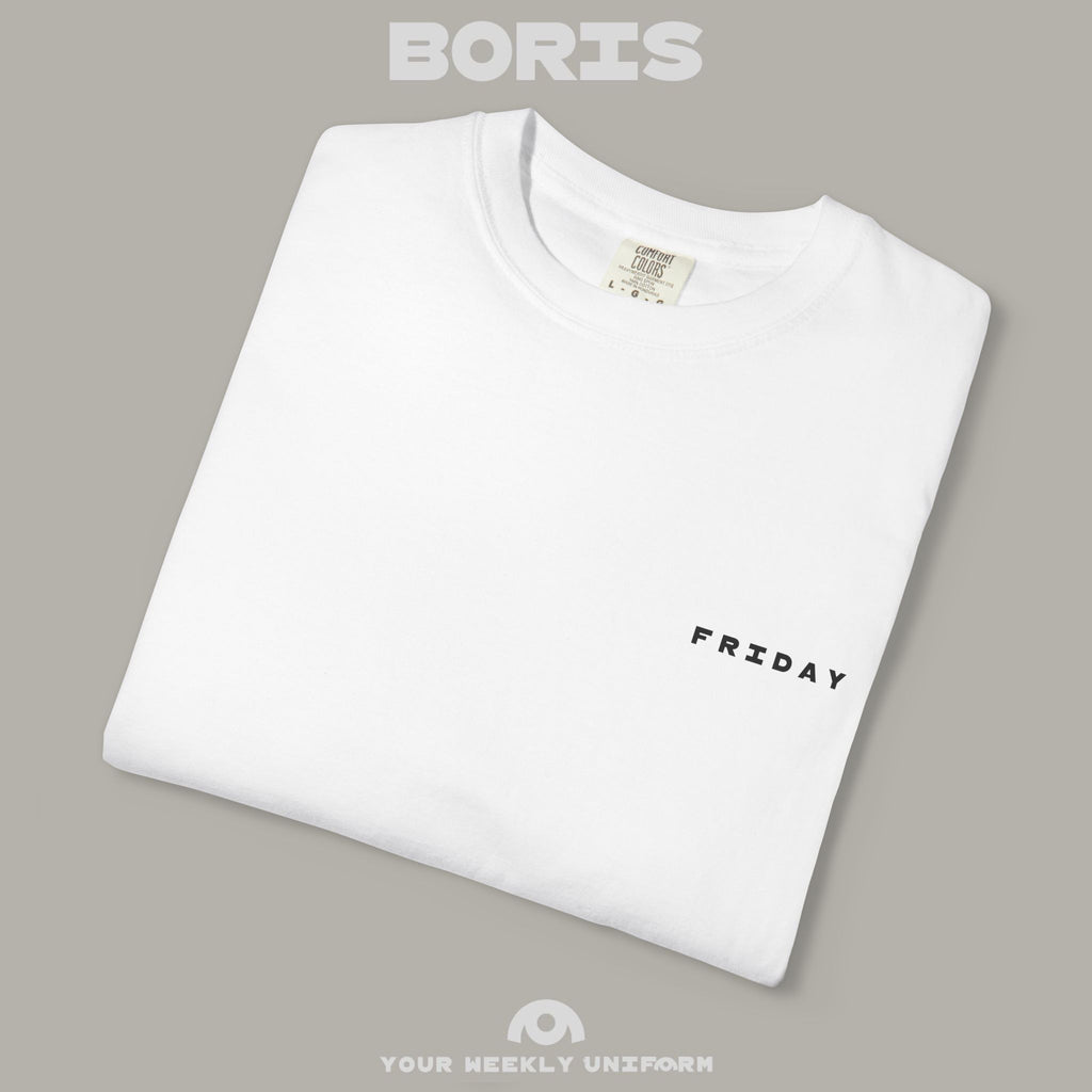 The BORIS WEEKLY t-shirts are sold as a 7 day pack, or individually. Each day of the week is printed on the front of the garment in the pocket position, and our text mark is printed on the rear outside neck. The T-Shirts are 100% Cotton, crazy soft, wear with a little bit of heft, a sort of medium weight like your favorite concert T-Shirt after years of washing. They drop just below the belt/waist, are true to size, but can have a slightly baggy vibe if you order a size up. They get even better with each wash. We know these will become your favorite T-Shirts.