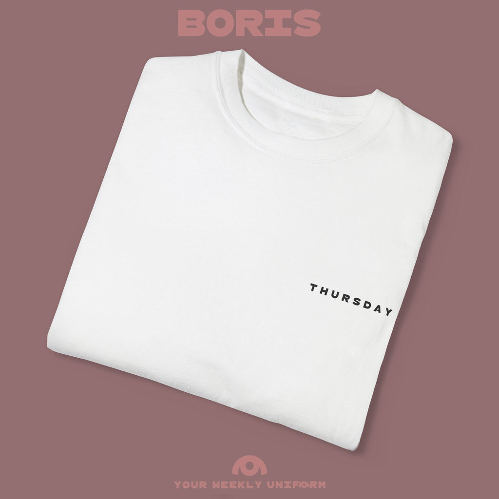 The BORIS WEEKLY t-shirts are sold as a 7 day pack, or individually. Each day of the week is printed on the front of the garment in the pocket position, and our text mark is printed on the rear outside neck. The T-Shirts are 100% Cotton, crazy soft, wear with a little bit of heft, a sort of medium weight like your favorite concert T-Shirt after years of washing. They drop just below the belt/waist, are true to size, but can have a slightly baggy vibe if you order a size up. They get even better with each wash. We know these will become your favorite T-Shirts.